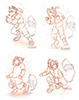 Pencil (traditional) or Photoshop (digital). Single cleaned up character or 4-5 rough pose sketches of a single idea.