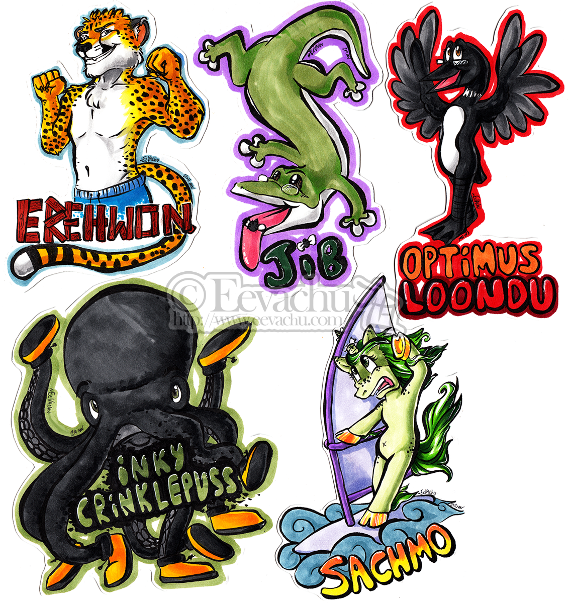 + $45 per character on the sticker, maximum of 4 + $90 to have a matching or couple's sticker, this comes with 20 individual stickers (10 of each design) that will interlock and the same amount of extras you'd get by ordering 2 sets + $0.50-$1.50 per sticker for more physical stickers (depnding on how many are ordered at once). There are additional shipping charges for orders with more than 100 stickers.