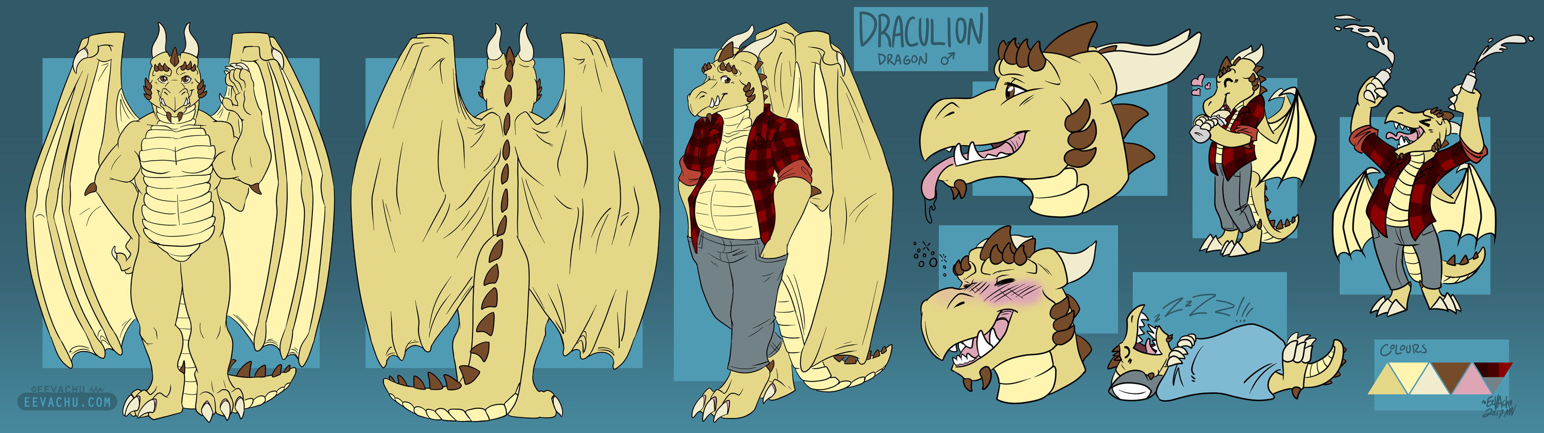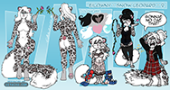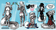Model reference sheet of one character. Choice of full-body views and close-ups (for expressions or accessories)/toony or chibi poses (for outfits/hobbies/etc.)/likes and dislikes box (for favourite foods/stuffed toys/hobbies/etc.). Optional colour palette and info box (no extra charge, colour palette will be included as default, info box with text will not). Available in Digital only.