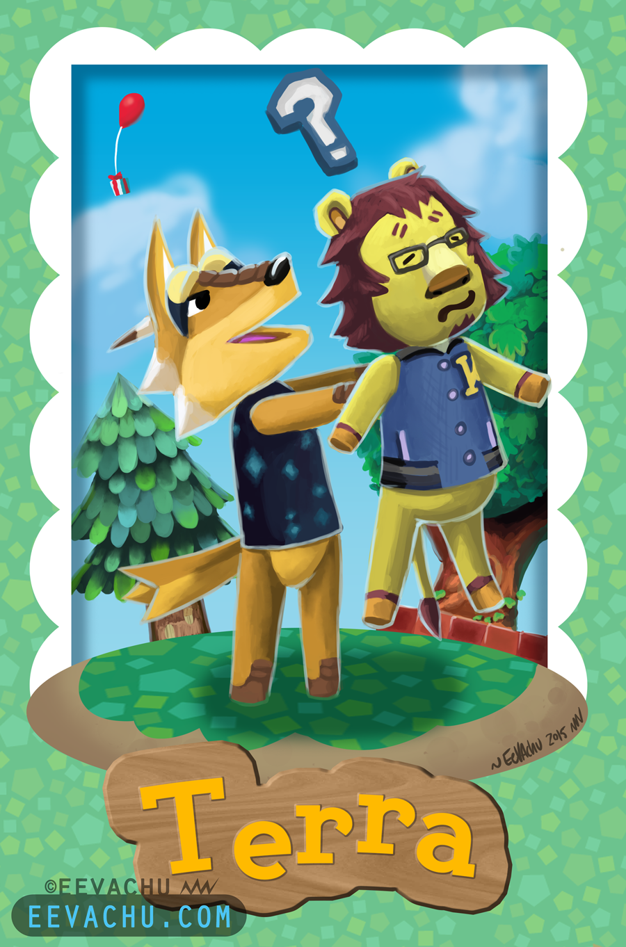 In the style of the Animal Crossing video game series. Choice of background. Available in Digital only.