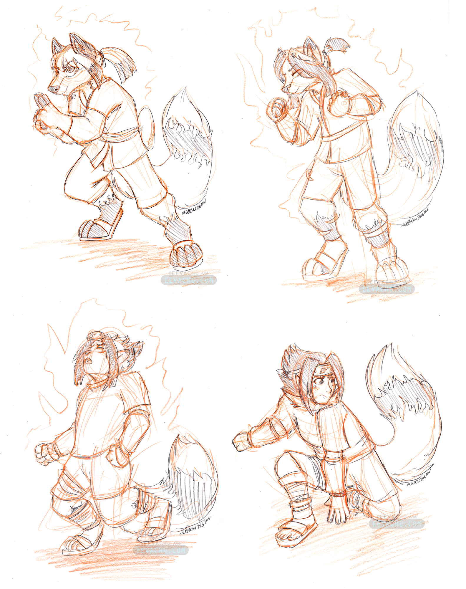 Pencil (traditional) or Photoshop (digital). Single cleaned up character or 4-5 rough pose sketches of a single idea.